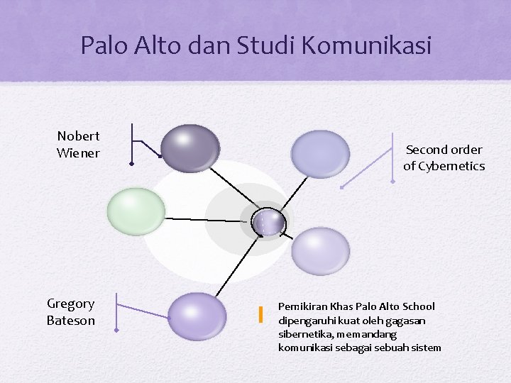 § Bersama-sama dengan Gagasan Nobert Wiener tentang Cybernetics, pemikiran Heinz von Foester turut mempengaruhi pemikiran Gregory Bateson dalam Mahzab Palo Alto (Rogers, 1997) § Kemudian, pemikiran Gregory Bateson mengilhami munculnya pemikiran Watzlawick, Beavin dan Jackson (dari Mahzab Palo Alto juga) khususnya dalam menggambarkan komunikasi interpersonal (Craig & Muller, 2007)