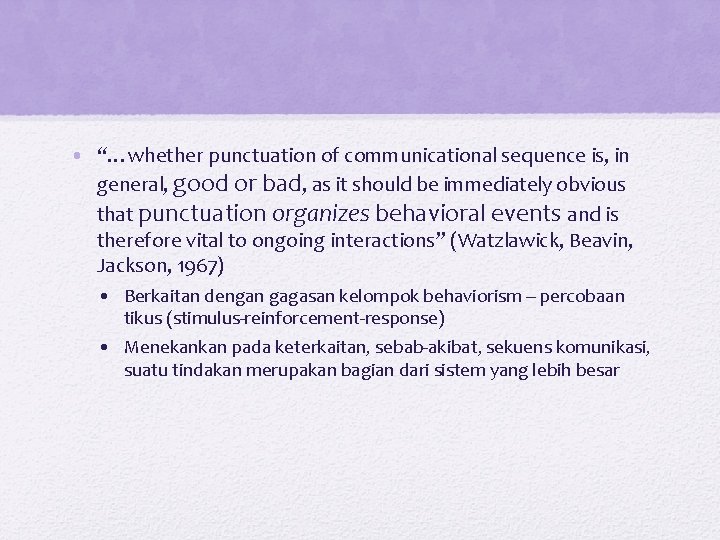 • “…whether punctuation of communicational sequence is, in general, good or bad, as it should be immediately obvious that punctuation organizes behavioral events and is therefore vital to ongoing interactions” (Watzlawick, Beavin, Jackson, 1967) • Berkaitan dengan gagasan kelompok behaviorism – percobaan tikus (stimulus-reinforcement-response) • Menekankan pada keterkaitan, sebab-akibat, sekuens komunikasi, suatu tindakan merupakan bagian dari sistem yang lebih besar