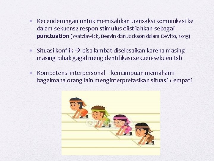 • Kecenderungan untuk memisahkan transaksi komunikasi ke dalam sekuens 2 respon-stimulus diistilahkan sebagai punctuation (Watzlawick, Beavin dan Jackson dalam De. Vito, 2013) • Situasi konflik bisa lambat diselesaikan karena masing pihak gagal mengidentifikasi sekuen-sekuen tsb • Kompetensi interpersonal – kemampuan memahami bagaimana orang lain menginterpretasikan situasi + empati