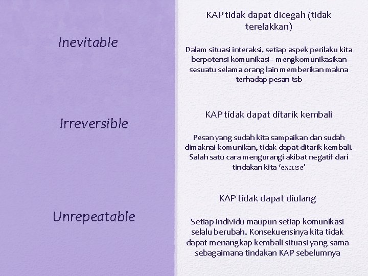 KAP tidak dapat dicegah (tidak terelakkan) Inevitable Irreversible Dalam situasi interaksi, setiap aspek perilaku kita berpotensi komunikasi-- mengkomunikasikan sesuatu selama orang lain memberikan makna terhadap pesan tsb KAP tidak dapat ditarik kembali Pesan yang sudah kita sampaikan dan sudah dimaknai komunikan, tidak dapat ditarik kembali. Salah satu cara mengurangi akibat negatif dari tindakan kita ‘excuse’ KAP tidak dapat diulang Unrepeatable Setiap individu maupun setiap komunikasi selalu berubah. Konsekuensinya kita tidak dapat menangkap kembali situasi yang sama sebagaimana tindakan KAP sebelumnya