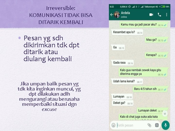 Irreversible: KOMUNIKASI TIDAK BISA DITARIK KEMBALI • Pesan yg sdh dikirimkan tdk dpt ditarik atau diulang kembali Jika umpan balik pesan yg tdk kita inginkan muncul, yg dpt dilakukan adlh mengurangi atau berusaha memperbaiki situasi dgn excuse