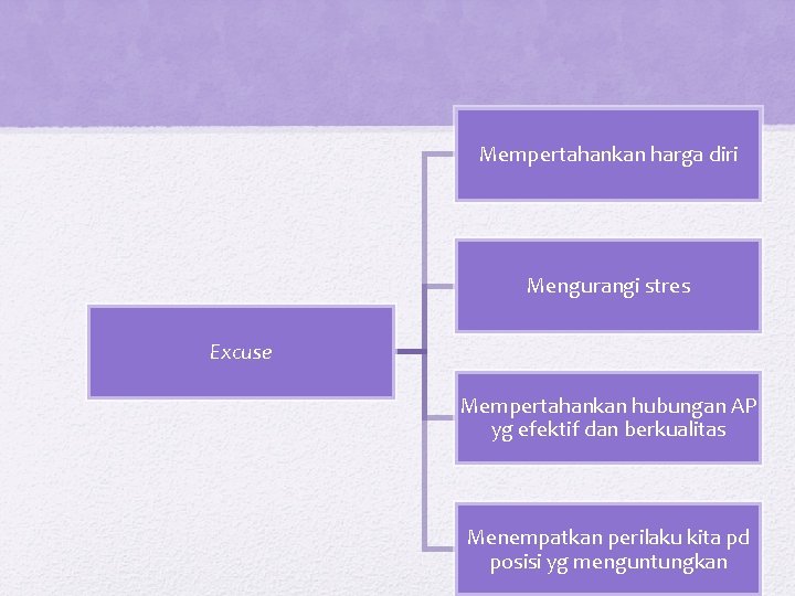 Mempertahankan harga diri Mengurangi stres Excuse Mempertahankan hubungan AP yg efektif dan berkualitas Menempatkan perilaku kita pd posisi yg menguntungkan