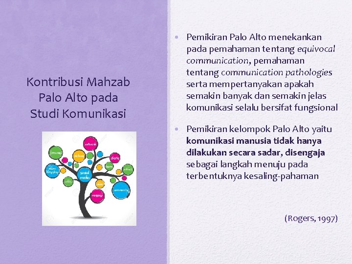 Kontribusi Mahzab Palo Alto pada Studi Komunikasi • Pemikiran Palo Alto menekankan pada pemahaman tentang equivocal communication, pemahaman tentang communication pathologies serta mempertanyakan apakah semakin banyak dan semakin jelas komunikasi selalu bersifat fungsional • Pemikiran kelompok Palo Alto yaitu komunikasi manusia tidak hanya dilakukan secara sadar, disengaja sebagai langkah menuju pada terbentuknya kesaling-pahaman (Rogers, 1997)