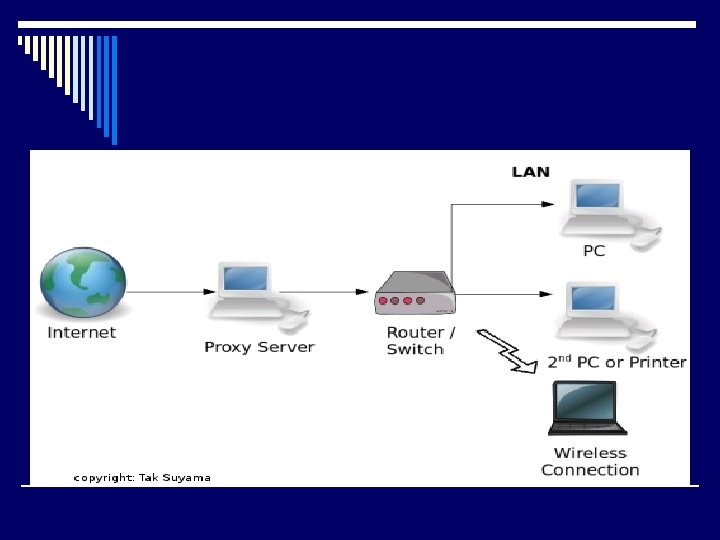 Proxy srver o Proxy serevr je server koji drugim računarima omogućava posrdan pristup sadržajima na internetu. U prevodu engleski pojam proxy server znači server posrednik. o Proxy serveri doprinose poboljšanju Web performansi tako što skladište kopije Web stranica koje se često koriste. Kada pregledač zahteva Web stranicu koja je uskladištena u okviru kolekcije proxy servera (njegova keš memorija), nju obezbeđuje proxy server, što je brže od odlaska na Web. Proxy serveri doprinose i poboljšanju bezbednosti tako što filtriraju neke Web sadržaje i zlonamerni softver.