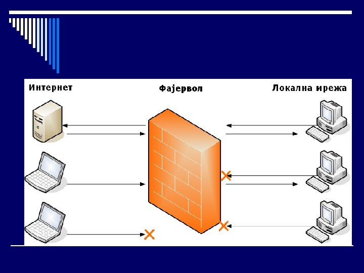 Bezbednosna barijera (Firewall) o Firewall je bezbednosni harverski ili softverski uređaj, najčešće smešten između lokalne mreže i javne mreže, čija je namena da štiti podatke u mreži od neautorizovanih korisnika. o Vrlo često ne moraju svi korisnici u LAN-u da imaju jednaka prava pristupa mreži. Postavljanjem firewall uređaja između dva ili više mrežnih segmenta mogu se kontrolisati i prava pristupa pojedinih korisnika pojedinim delovima mreže.