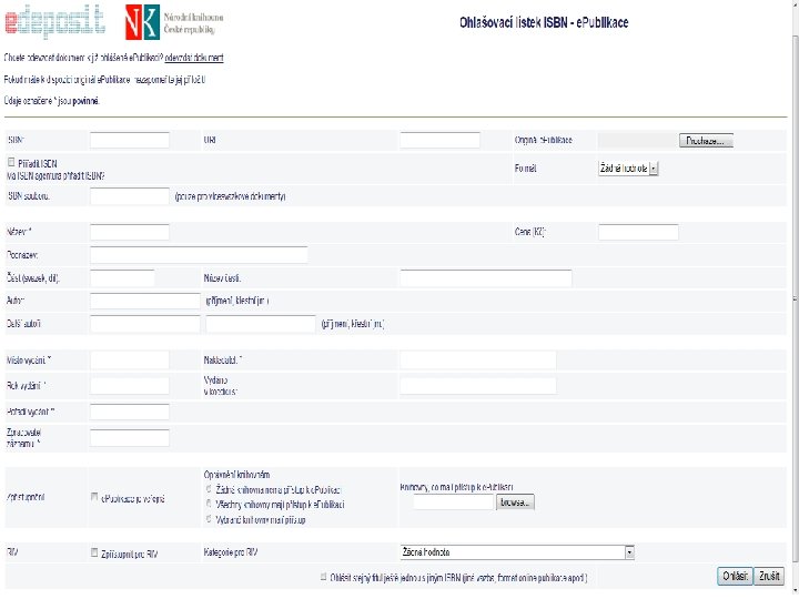 Registrace producenta a ohlášení e-publikace V systému e-Deposit producent: • vyplní on-line formulář se základními údaji • vytvoří producenta a uživatele • stáhne si smlouvu, vyplní ji a načte do systému Ø ohlásí e-publikace v připraveném formuláři Ø vloží soubor s nebo bez registrace ISBN Ø určí míru zpřístupnění e-publikace Systém e-Deposit provede: • kontrolu souboru, načtení metadat ze souboru • vytvoření náhledu transformací souboru do PDF • kontrolu duplicity ISBN