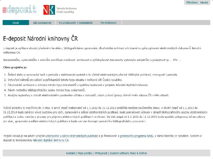 Technologický rámec projektu 1. vytvořit systém e-Deposit a propojit ho s dalšími zdroji (knihovní systém Aleph, systém Kramerius), což umožní přijímání, zpracování, sdílení a další zpřístupňování e-publikací v knihovní síti ČR • testovací verze aplikace na http: //edeposit-test. nkp. cz/ • leden 2015 - plánované spuštění pilotního provozu systému e-Deposit v plné otevřené podobě 2. zajistit archivaci a dlouhodobou ochranu dokumentů (LTP) ve spolupráci s projektem Národní digitální knihovny (NDK)