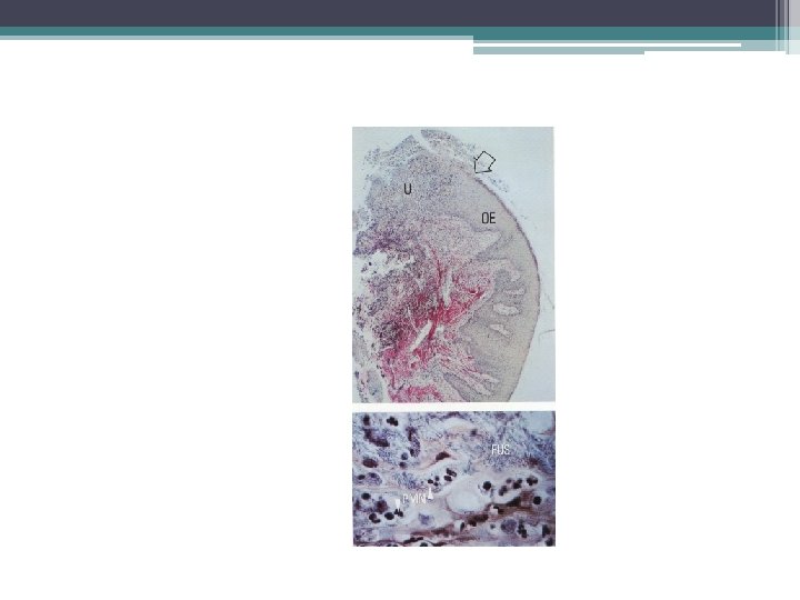 NUG ETİYOLOJİSİ Etiyolojisi bakteriyel enfeksiyonla ilişkilidir. NUG gingival lezyonunun bakteri ile ilişkisinde 4 tabakası vardır: -Bakteriyel tabaka: lökosit, bakteri (Spiroketler ) Nötrofilden zengin tabaka (bakteri tabakasını takip eder) Nekrotik tabaka Spiroketal infiltrasyon tabakası her tabakada spiroketler vardır.