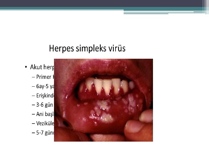 HERPETİK GİNGİVİTİS Akut herpetik gingivostomatit • • ETİYOLOJİSİ: Herpes simpleks virüsüdür. Viral bir enfeksiyondur. Çocuklar, 20 -25 yaş genç erişkinler de görülür. Ateş, lenf nodları ağrılı şişer akut ağrılı gingivitis tablosu • Oral mukoza ve dudaklarda aft benzeri önceleri veziküllü eroziv lezyonlar izlenir.