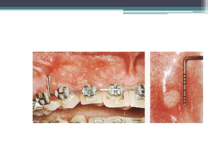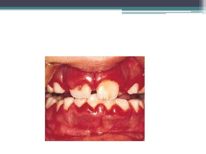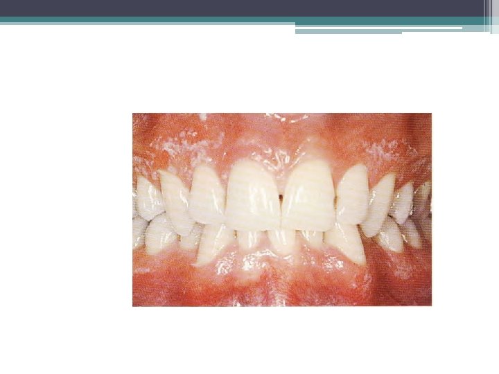 Streptokokal gingivitis • Çocuklarda boğaz enfeksiyonunu takiben dişetlerinde kızarıklık ağrı ile karakterize durum. • Boğaz enfeksiyonu için kullanılan antibiyotik, uygun ağız bakımı iyileşir.