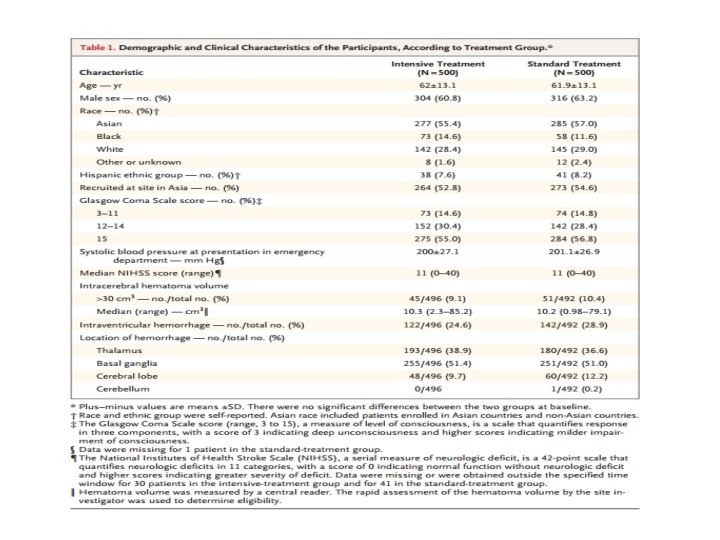 • Çalışmanın tedavi amacı – Standart tedavi gurubun da saatlik SKB 140 -179 – Yoğun tedavi grubun da SKB 110 -139 arasında tutmaktı. – Ve her iki grupta randomizasyon sonrası 24 saat boyunca bu değerleri sürdürmekti. • Randomizasyon öncesi SKB 180 mm hg altına düşürmek için IV anti-hipertansif tedavi uygulanmış olabilir. Ama SKB 140 mmhg altına düşen hastalar çalışmaya uygun değildi