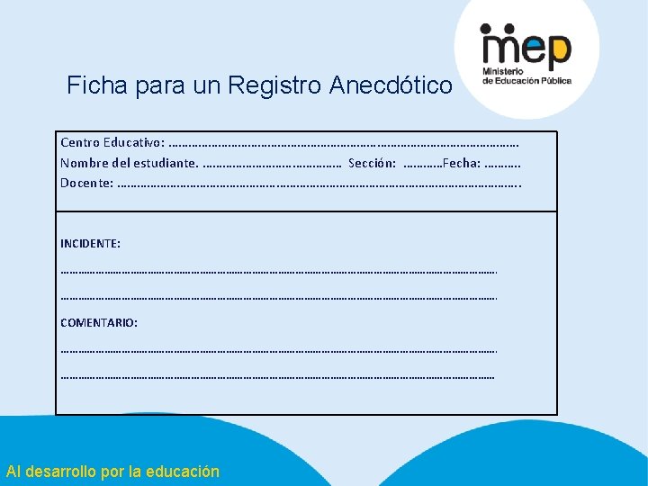 El Registro Anecdótico Proporciona una descripción del comportamiento del estudiante en situaciones naturales. Consiste en una ficha personal del estudiante, en la cual se realizan anotaciones de cualquier situación que se presenta. Al desarrollo por la educación