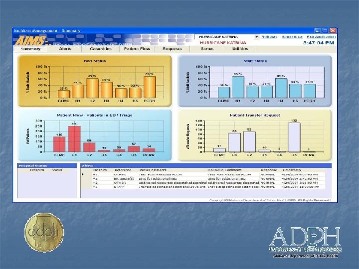 AIMS n n n Tracks bed availability in hospitals, nursing homes, medical needs shelters and other locations as well as capacity within the EMS system Tracks resources at facilities including staff and supplies. Allows for immediate requests for assistance or offers of assistance.