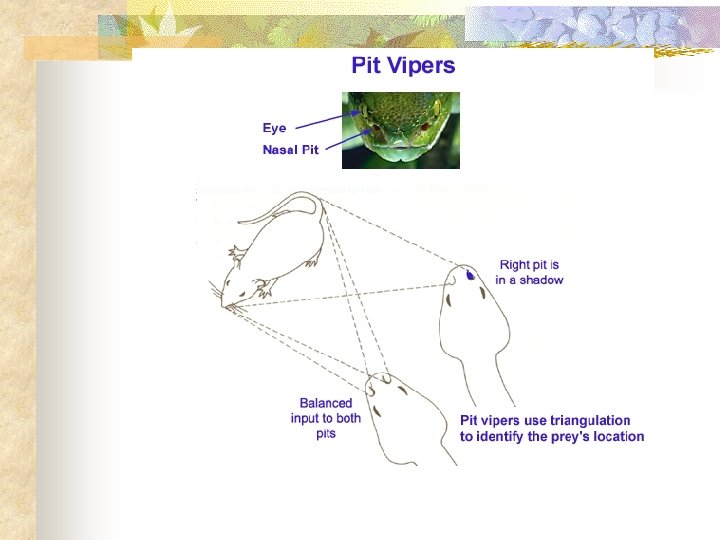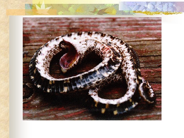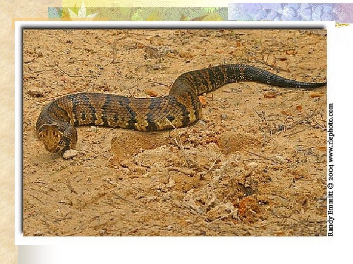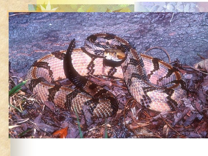 Family Viperidae Includes many dangerously venomous snakes. Most are stout-bodied, with heads distinctly wider than the neck. Most are patterned with crossbands or blotches. Have hollow, retractable fangs situated near the front of the upper jjaw. In pit vipers, a heat-sensitive pit is present on each side of the head between the eye and the nostril. Eyes have vertical pupils and an undivided row of scales under the tail. Venom is a complex mix of proteins acting primarily on the victim’s blood tissue. Most pit vipers bear their young alive.