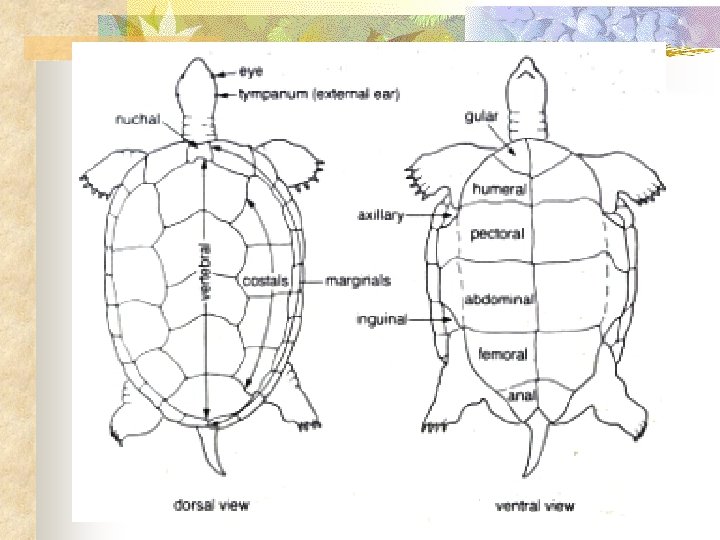 Order Testudinata The turtles have the body enclosed in a bony case of dermal plates with a dorsal carapace and a ventral plastron. Their jaws have no teeth, but do have a horny sheath. The vertebra and ribs are fused to the shell. The anus is a longitudinal slit.