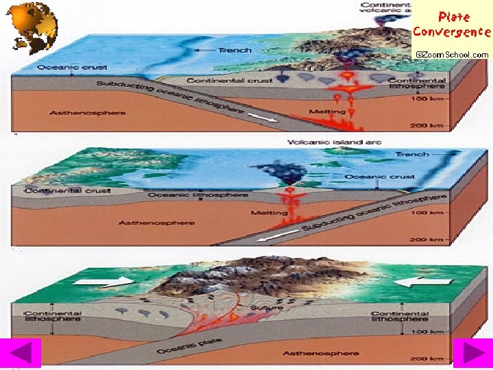 • Zona Divergensi Gerakan saling menjauh antar lempeng tektonik. Contohnya benua Amerika dengan Eropa. • Zona Konvergensi Gerakan saling bertumbukan antar lempeng tektonik. Contohnya Lempeng India dengan lempeng Eurasia (peg. Himalaya) dan lempeng indo-australia dengan lempeng Eurasia (palung Jawa). • Zona Sesar Mendatar Gerakan saling bergesekan antar lempeng tektonik yang arahnya berlawanan. Contohnya adalah patahan San Andreas di Amerika Serikat