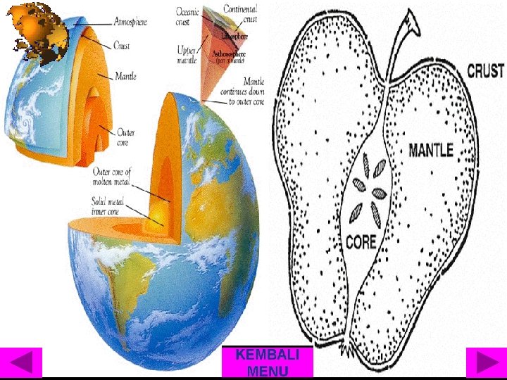 • • • Bumi dapat dibagi menjadi tiga lapisan: Crust (lapisan kerak/kulit) adalah lapisan yang terdiri batuan pembentuk kulit bumi dan merupakan lapisan paling atas/luar. Mantel (Lapisan tengah) adalah lapisan yang berupa material kental dan pijar (30000 C) yang disebut astenosfer Barisfer (inti luar dan dalam) adalah lapisan yang teriri dari besi dan nikel. Lapisan inti luar merupakan lapisan pijar yang kental sedangkan inti dalam merupakan lapisan padat.
