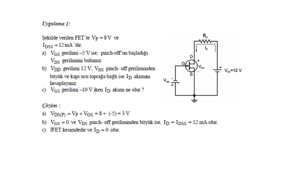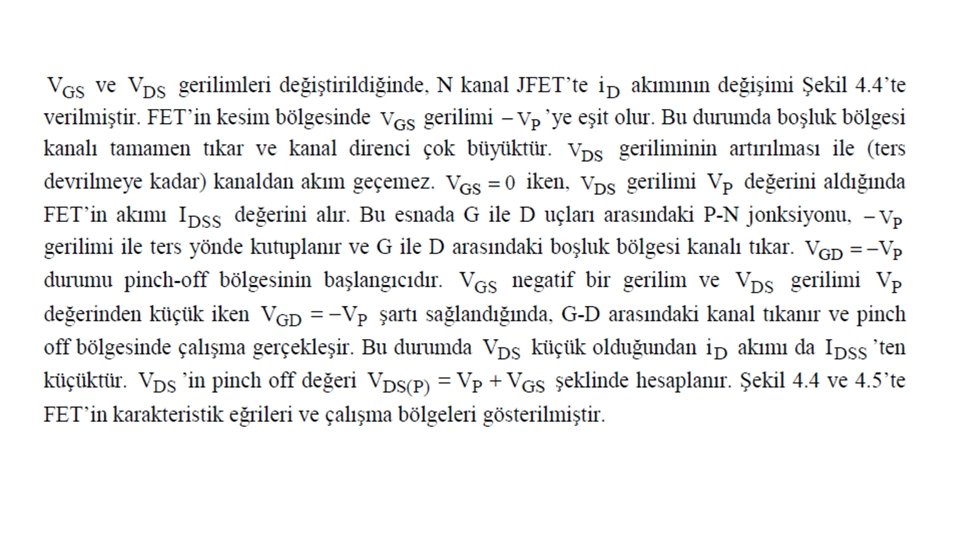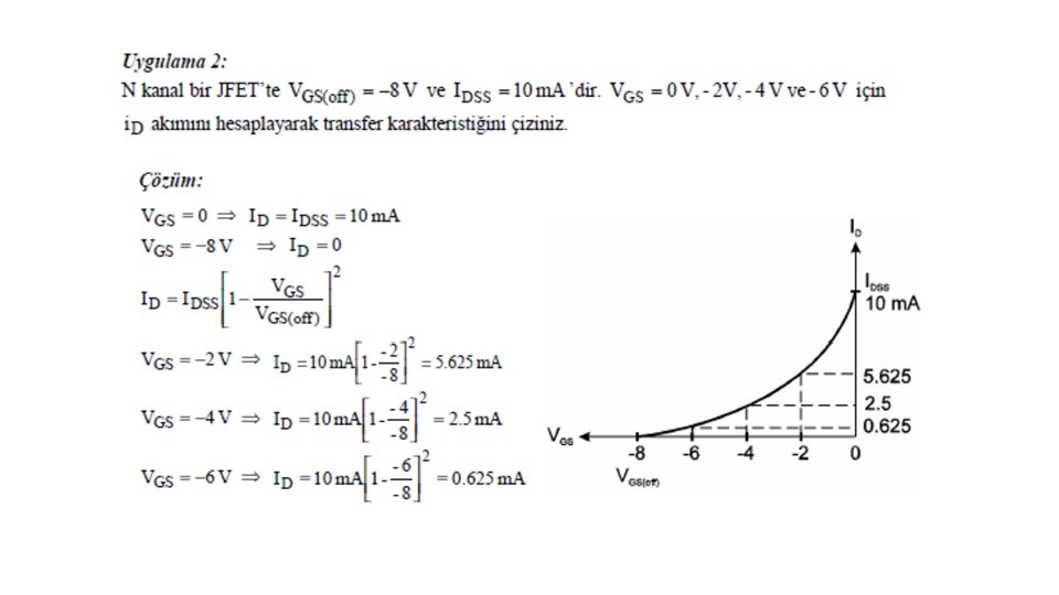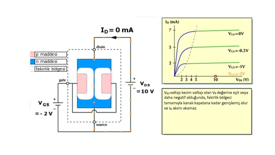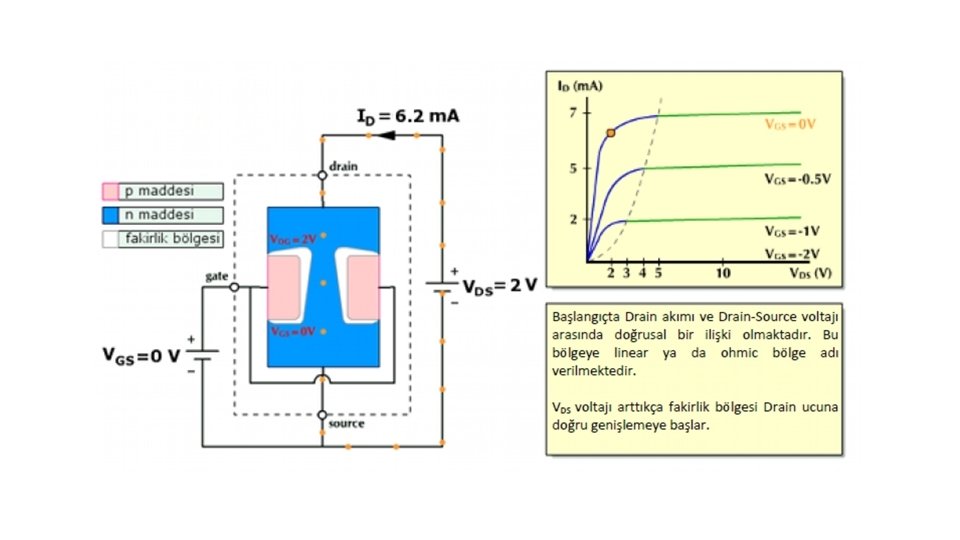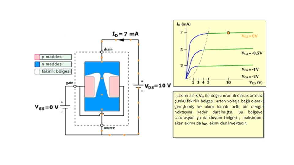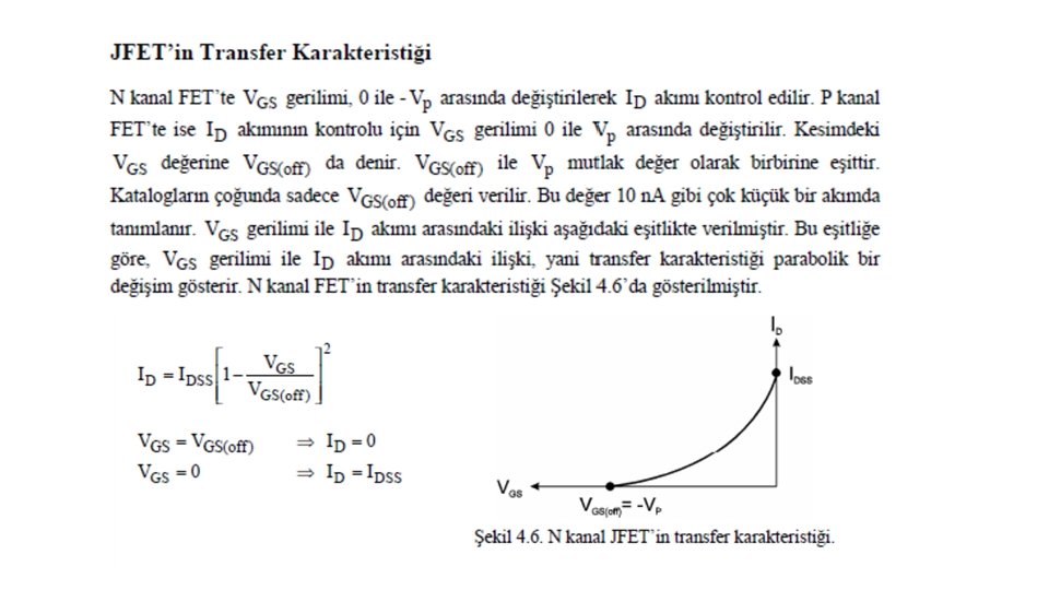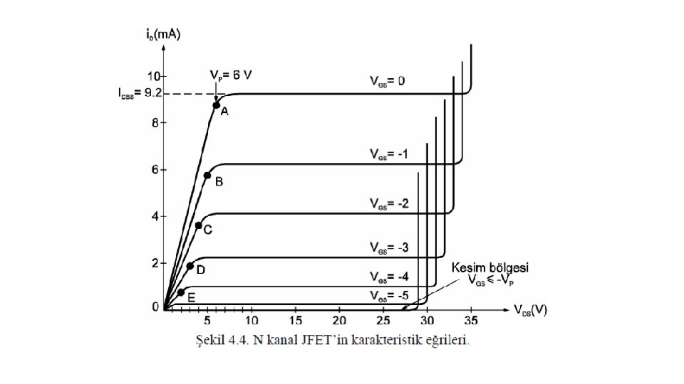 VGS = 0 iken VDS geriliminin arttırılması ile N kanal JFET’te elde edilen karakteristik Şekil 4. 3’te gösterilmiştir. A ile B noktaları arasındaki direnç bölgesinde VDS ’nin 0’dan itibaren arttırılması ile i. D akımı IDSS değerine kadar artar. A ile B arasında, boşluk bölgesinin genişliği etkili olmadığından kanalın direnci sabittir. VGS = 0 iken geçen IDSS akımı FET’in maksimum akımıdır. B noktasında VDS gerilimi VP değerini alır. B noktasından sonra, VDS geriliminin artırılması ile i. D akımı değişmez. C noktasından sonra VDS geriliminin artırılması, P-N jonksiyonunun ters yönde devrilmesine neden olur ve i. D akımı hızla artar. B ile C noktaları arasındaki bölgeye pinch-off bölgesi denir. P-N jonksiyonunun ters kutuplanması ile oluşan boşluk, pinch off bölgesinde kanalı tıkar ve kanal direncini artırır. Buna rağmen kanal akımı sabit kalır. Akımın sabit kalmasının nedeni, VDS geriliminin kanal direncindeki artışı dengelemesidir. VDS gerilimi, kaynaktan çıkan elektronların tıkalı bölgeyi geçerek D ucuna ulaşmasını sağlar. B noktasındaki VDS gerilimine VP pinch-off gerilimi denir.