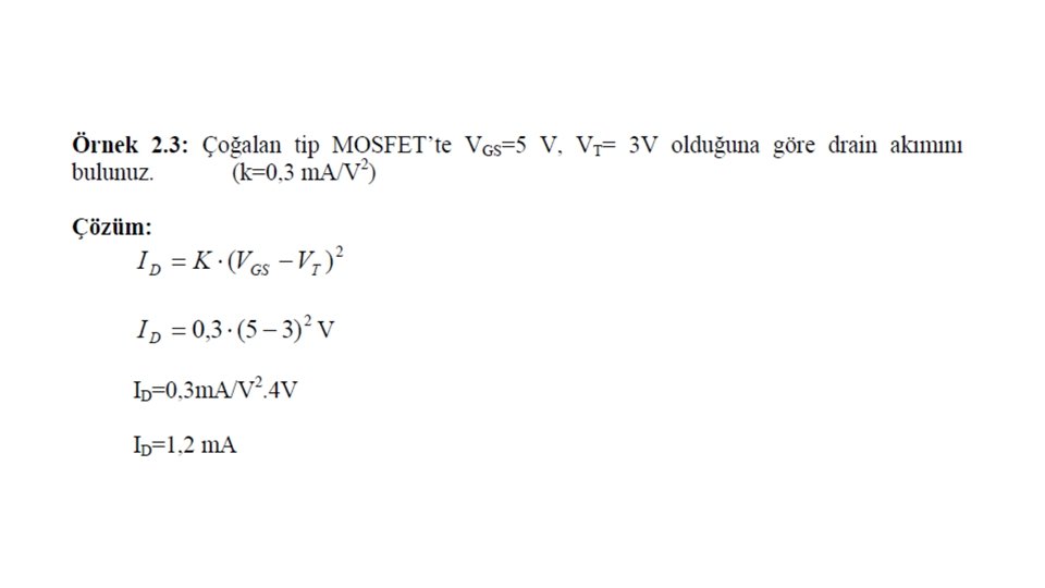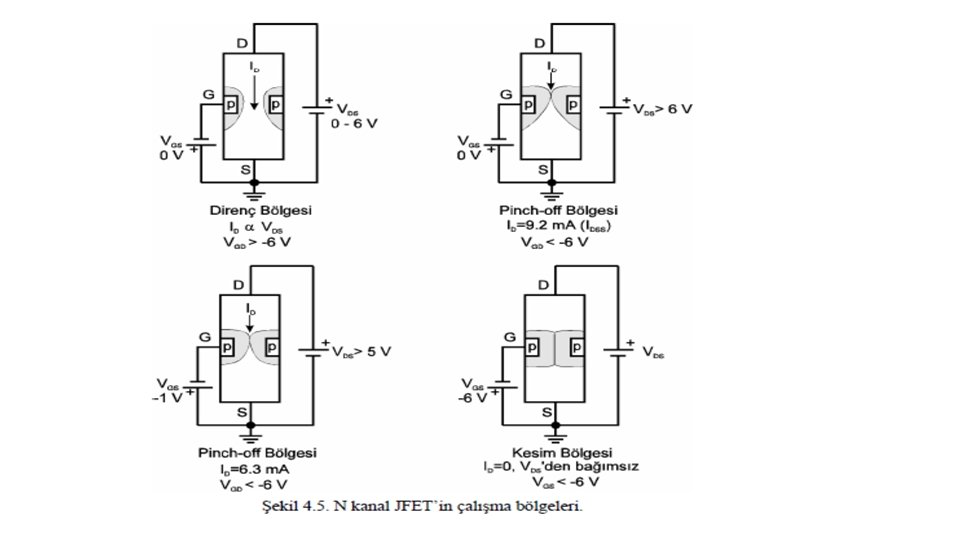 Şekil 4. 2. N kanal JFET’in çalışma prensibi. N kanal FET’te G ile S uçları arasına 0 veya negatif bir gerilim, D ile S uçları arasına ise pozitif bir gerilim uygulanır. Kapıdan kanala olan P-N jonksiyonu ters yönde kutuplanır. VGD = VGS − VDS olduğuna göre, VGD gerilimi VGS’e göre daha negatiftir. Bu nedenle, G ile D arasındaki bölgede ters yönde kutuplanan P-N diyodunun boşluk bölgesi daha geniş olur.