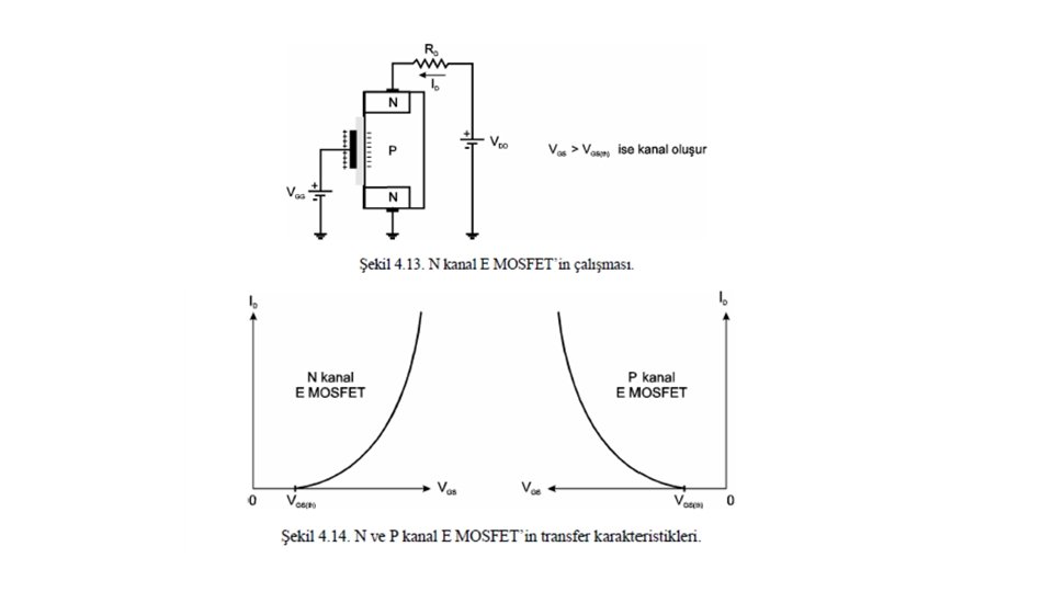E MOSFET’in yapı ve sembolü Şekil 4. 12’de gösterilmiştir. Bu MOSFET’te fiziksel bir kanal yoktur. N kanal E MOSFET’te kapıya uygulanan gerilim eşik değerinde, Si. O 2 tabakasına komşu olan P malzemesinde ince bir negatif yük tabakası ve bir kanal oluşturur. Eşik geriliminin altında bir kanal oluşmaz. Kapı kaynak arasındaki pozitif gerilim arttırıldığında kanala daha çok elektron çekilir ve kanalın iletkenliği artar. N kanal E MOSFET’in çalışma prensibi Şekil 4. 13’te gösterilmiştir.