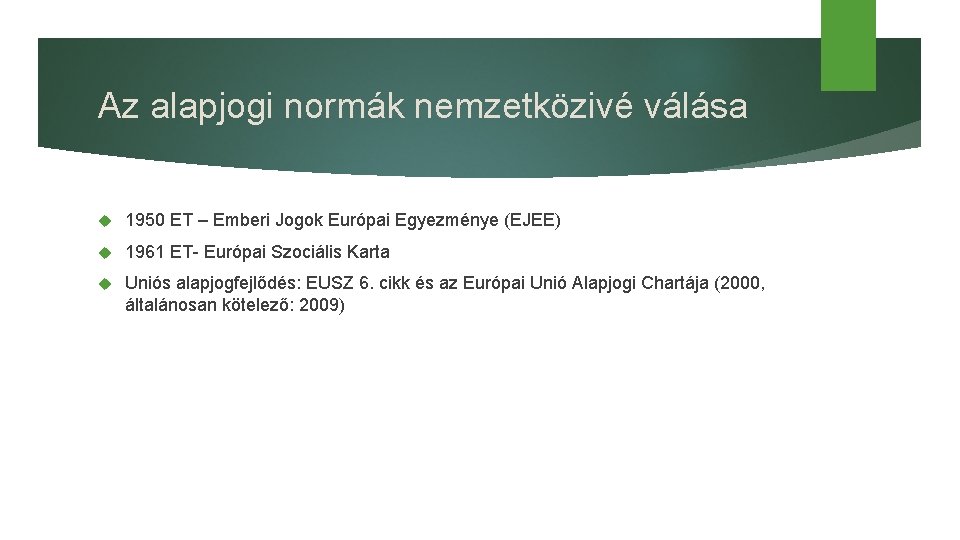 Az alapjogi normák nemzetközivé válása 1950 ET – Emberi Jogok Európai Egyezménye (EJEE) 1961 ET- Európai Szociális Karta Uniós alapjogfejlődés: EUSZ 6. cikk és az Európai Unió Alapjogi Chartája (2000, általánosan kötelező: 2009)