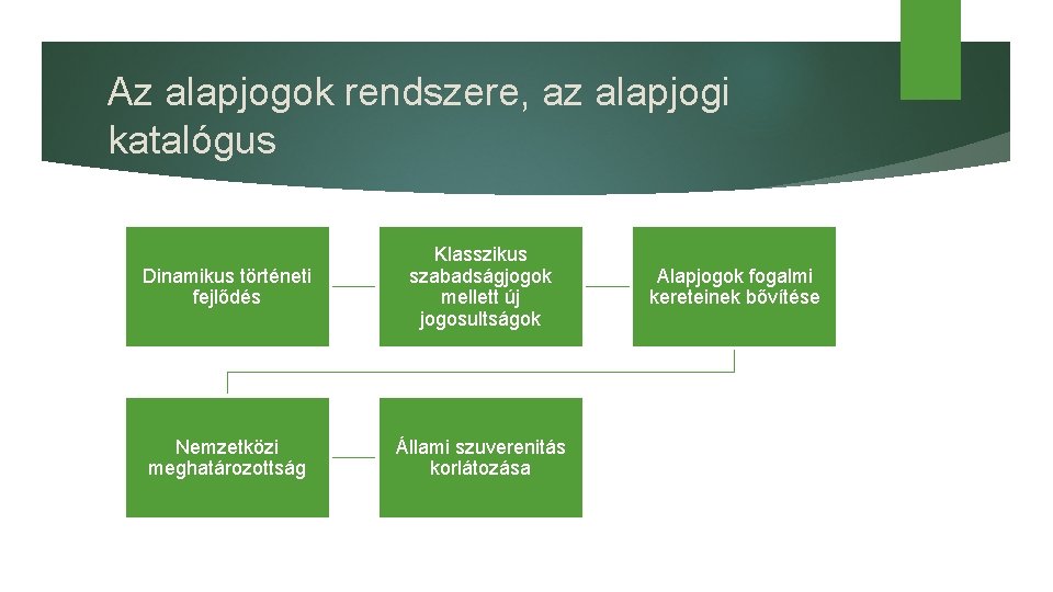 Az alapjogok rendszere, az alapjogi katalógus Dinamikus történeti fejlődés Klasszikus szabadságjogok mellett új jogosultságok Nemzetközi meghatározottság Állami szuverenitás korlátozása Alapjogok fogalmi kereteinek bővítése