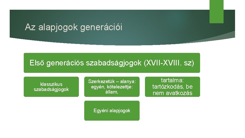 Az alapjogok generációi Első generációs szabadságjogok (XVII-XVIII. sz) klasszikus szabadságjogok Szerkezetük – alanya: egyén, kötelezettje: állam, Egyéni alapjogok tartalma: tartózkodás, be nem avatkozás