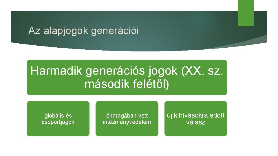 Az alapjogok generációi Harmadik generációs jogok (XX. sz. második felétől) globális és csoportjogok önmagában vett intézményvédelem új kihívásokra adott válasz