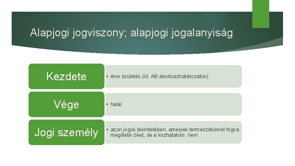 Alapjogi jogviszony; alapjogi jogalanyiság Kezdete Vége Jogi személy • élve születés (ld. AB abortuszhatározatok) • halál • azon jogok tekintetében, amelyek természetüknél fogva megilletik őket, de a közhatalom: nem