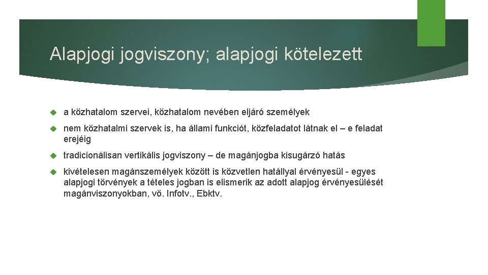 Alapjogi jogviszony; alapjogi kötelezett a közhatalom szervei, közhatalom nevében eljáró személyek nem közhatalmi szervek is, ha állami funkciót, közfeladatot látnak el – e feladat erejéig tradicionálisan vertikális jogviszony – de magánjogba kisugárzó hatás kivételesen magánszemélyek között is közvetlen hatállyal érvényesül - egyes alapjogi törvények a tételes jogban is elismerik az adott alapjog érvényesülését magánviszonyokban, vö. Infotv. , Ebktv.
