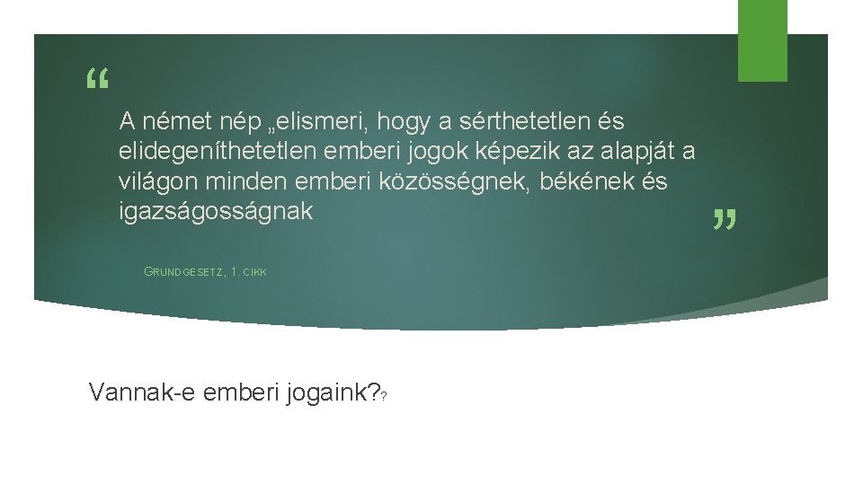 “ A német nép „elismeri, hogy a sérthetetlen és elidegeníthetetlen emberi jogok képezik az alapját a világon minden emberi közösségnek, békének és igazságosságnak GRUNDGESETZ, 1. CIKK Vannak-e emberi jogaink? ? ”