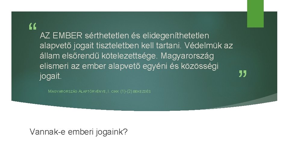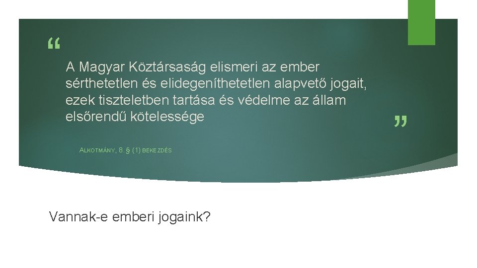 “ A Magyar Köztársaság elismeri az ember sérthetetlen és elidegeníthetetlen alapvető jogait, ezek tiszteletben tartása és védelme az állam elsőrendű kötelessége ALKOTMÁNY, 8. § (1) BEKEZDÉS Vannak-e emberi jogaink? ”