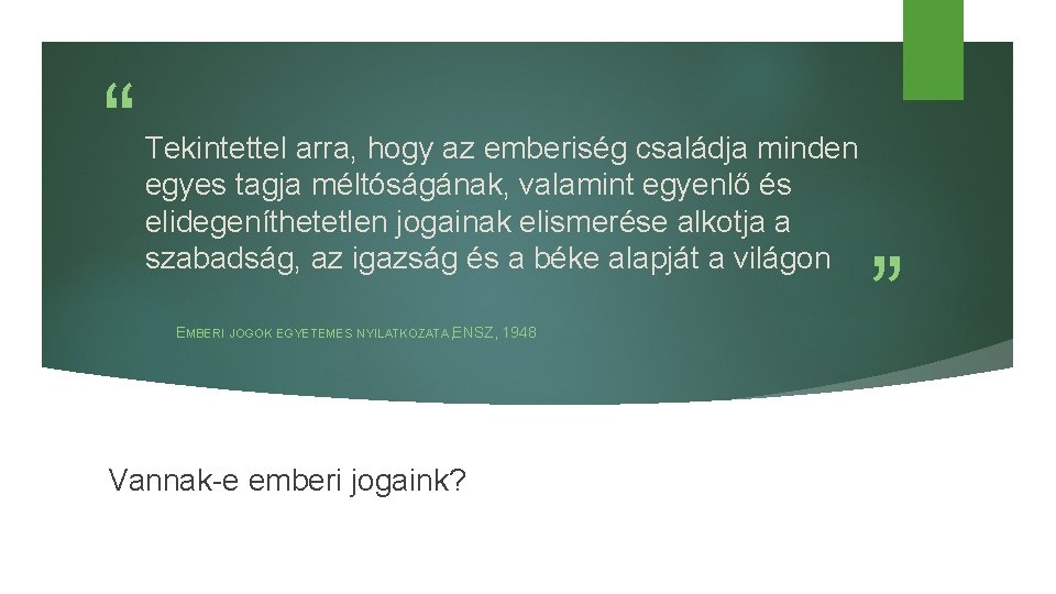 “ Tekintettel arra, hogy az emberiség családja minden egyes tagja méltóságának, valamint egyenlő és elidegeníthetetlen jogainak elismerése alkotja a szabadság, az igazság és a béke alapját a világon EMBERI JOGOK EGYETEMES NYILATKOZATA, ENSZ, 1948 Vannak-e emberi jogaink? ”