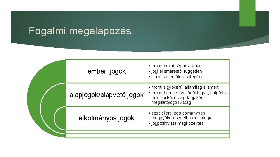 Fogalmi megalapozás emberi jogok alapjogok/alapvető jogok alkotmányos jogok • emberi minőséghez tapad • jogi elismeréstől független • filozófiai, erkölcsi kategória • morális gyökerű, államilag elismert, • embert emberi voltánál fogva, polgárt a politikai közösség tagjaként megilletőjogosultság • szocialista jogtudományban meggyökeresedett terminológia • jogpozitivista megközelítés