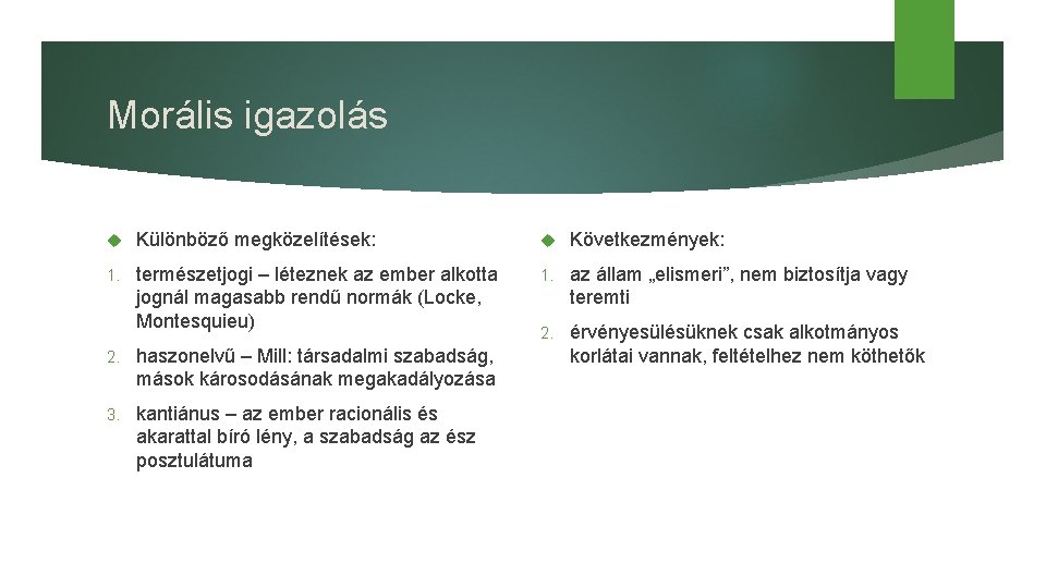 Morális igazolás Különböző megközelítések: Következmények: 1. természetjogi – léteznek az ember alkotta jognál magasabb rendű normák (Locke, Montesquieu) 1. az állam „elismeri”, nem biztosítja vagy teremti 2. érvényesülésüknek csak alkotmányos korlátai vannak, feltételhez nem köthetők 2. haszonelvű – Mill: társadalmi szabadság, mások károsodásának megakadályozása 3. kantiánus – az ember racionális és akarattal bíró lény, a szabadság az ész posztulátuma