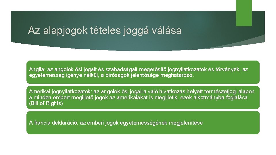 Az alapjogok tételes joggá válása Anglia: az angolok ősi jogait és szabadságait megerősítő jognyilatkozatok és törvények, az egyetemesség igénye nélkül, a bíróságok jelentősége meghatározó. Amerikai jognyilatkozatok: az angolok ősi jogaira való hivatkozás helyett természetjogi alapon a minden embert megillető jogok az amerikaiakat is megilletik, ezek alkotmányba foglalása (Bill of Rights) A francia deklaráció: az emberi jogok egyetemességének megjelenítése