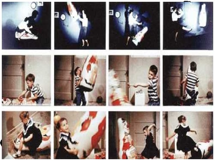 The experiment • BOBO DOLL EXPERIMENT –. Boys and girls watched a video of a person performing violent acts on a blowup clown named Bobo. Use of kicking, punching, and hammering were modeled. – When children were then left alone with the same blowup clown they performed the same behaviors they had observed.