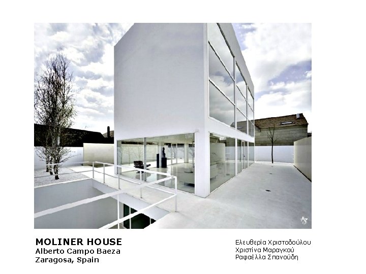 The house to be addressed is the Moliner house, located in the city Zaeagkoza in northern Spain. The architect is Alberto Campo Baeza from Spain. Some elements that characterize the way that Alberto is his tendency to design white houses. The Moliner house, was designed for a poet, Luis Moliner Lorente. So the ARCHITECT used poetry approach while planning the house. The main idea was that the building would become one with the sky. Τhe house limits environment by 5 m height walls. In this way the architect manage to isolate the building of the nearby elements, t o achieve the union with the sky. Analysing the house design, we can see that is divided into thee levels. At each level a specific program is identified and target in different activities and different everyday moments. The third and lowest level, is addressed to sleep. The second to the daily activities since it constitutes the living room, kitchen and the dining room. The garden belongs to this level. The first and highest level is addressed in thought, creation and the work of the poet. The architect says: ‘’ the highest level for dreaming, the garden level for living and the deepest level for sleeping’’ The characteristics and qualities of spaces of which consists in each level. Concerning 3 rd level. This space is semi-basement and is illuminated only by the light entering from the two holes that exist in the yard - plate on the 2 nd level. Utilised by the user only during sleeping and hygiene since at this level is the master bedroom and toilets. The house yard is an extension of the second level since is not located at street level and is somehow <built>. There is a pool in the yard and some deciduous trees. The internal space of the second level is the central part of the house, as it attracts various family activities since it is along the living room, dining room and kitchen. The internal space and the second level are open plan, where there are no real walls since the sides are covered by glass surfaces, which end at the columns. This is because the architect wanted to achieve the unification of interior with the exterior, ie to abolish the boundaries that separate the inside from the outside. Also the space is completely perforated in lighting. The first level where the poet is writes an d which is is the tallest, the architect wanted to resemble cloud, ie the user to feel that is in the sky. For his reason he create a big opening create a large opening on the south side of the room, which has a direct view of the sky due to the high that we are. It also allows sunlight to enter in the room with lighting and heating. On the north side of the room there is an oblong opening which frames the view.