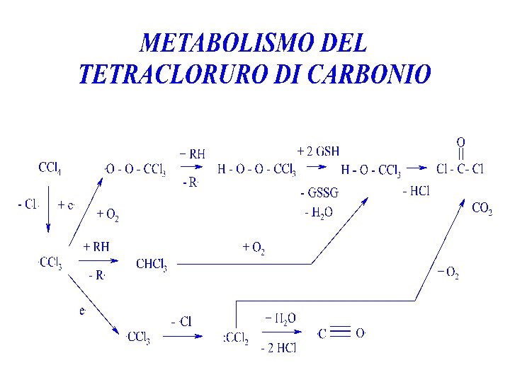 TETRACLORURO DI CARBONIO METABOLISMO Viene assorbito per via inalatoria, cutanea e digestiva. Viene metabolizzato via cit. P-450 2 E 1 a radicali liberi (radicale triclorometilico e triclorometilperossido) che si legano irreversibilmente al cit. P-450 inattivandolo (attivazione suicida)