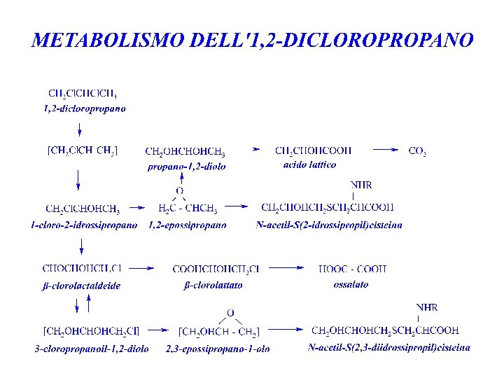 1, 2 -DICLOROPROPANO METABOLISMO viene ossidato a epossipropano che può seguire la via degli acidi mercapturici. Può anche essere metabolizzato ad acido lattico e acido ossalico.