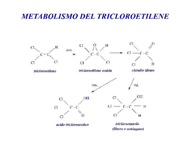 TRICLOROETILENE METABOLISMO Assorbito per via inalatoria viene metabolizzato via cit. P-450 a cloralio idrato e per successiva ossidazione ad acido tricloroacetico e riduzione a tricloroetanolo.