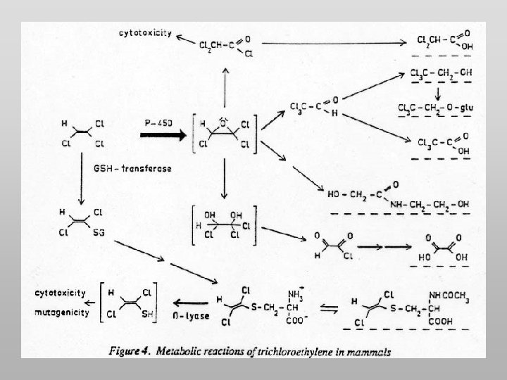 TRICLOROETILENE METABOLISMO Più del 99% dei metaboliti urinari tricloroetilene sono formati via cit. P-450: come TCA come TCE libero come TCE coniugato come ossalato come cistein-coniugato 6 -8% 5 -6% 22 -25% 0, 6 -0, 8% 0, 001% del