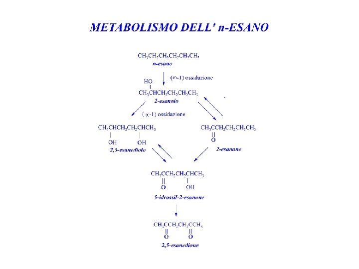 n-ESANO METABOLISMO Assorbito per via inalatoria e cutanea, si accumula nel tessuto adiposo. Viene eliminato come 2, 5 -esanedione.