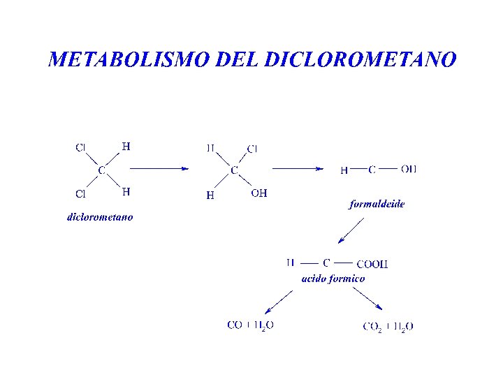 DICLOROMETANO METABOLISMO E’ metabolizzato per via ossidativa (cit. P-450 2 E 1) a formaldeide e acido formico, ma, in particolare a CO