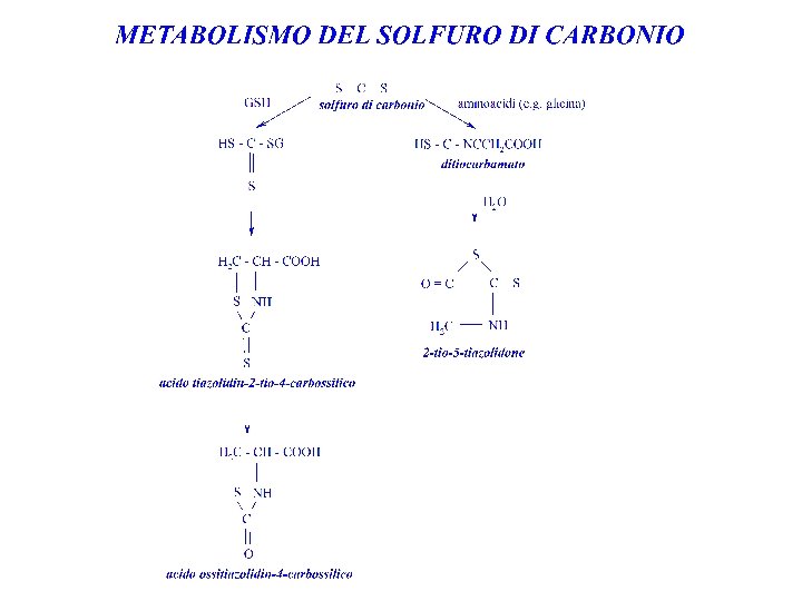 SOLFURO DI CARBONIO METABOLISMO Viene assorbito per via inalatoria e cutanea. Viene eliminato tal quale soprattutto per via respiratoria e solo l’ 1% viene eliminato con le urine. Il 50 -90% viene metabolizzato. Due vie metaboliche: la (1) porta alla formazione di ditiocarbamati e a coniugati col glutatione, la (2) dà origine a solfuri reattivi.