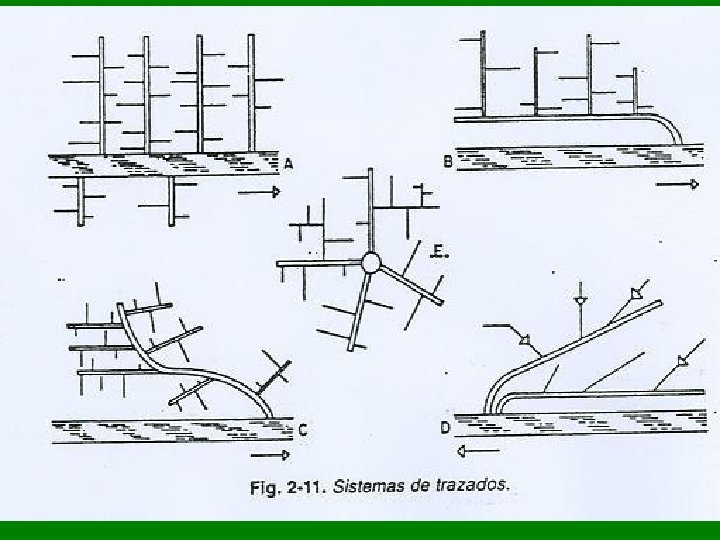 Configuración de los Sistemas c. Modelo de Zona Se obtiene mediante colectores paralelos al cauce, con pendientes pequeñas pero escasas zonas de vertido. El emisario puede tener ya pendiente normal y construirse en terreno mejor d. Modelo de Abanico Se realiza a base de colectores ramificados hacia diferentes zonas, reunidos en el punto que mejor convenga para su desagüe. Es el sistema, quizá, más indicado para poblaciones o sectores de población sumamente llanas