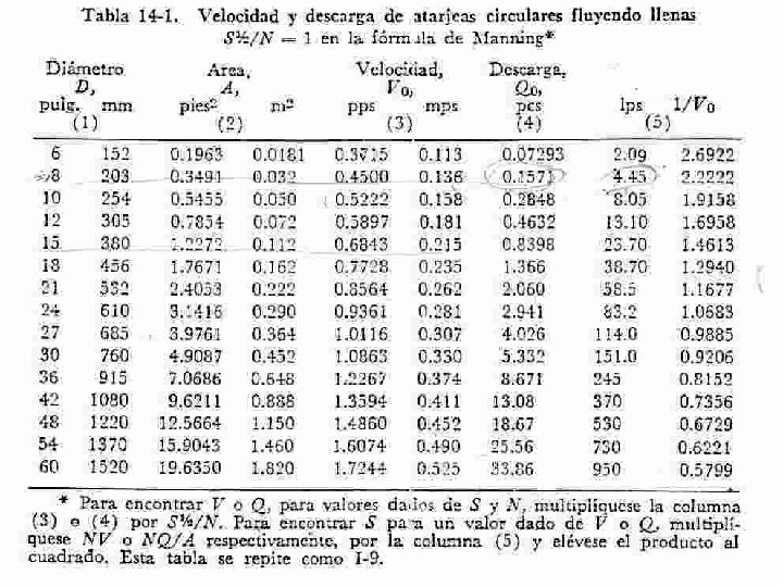 10 -Se determina el diámetro requerido para conducir el caudal máximo de diseño. Para ello, se usa tabla 14. 1 que da el caudal y la velocidad a tubo lleno utilizando la fórmula de Manning. ( ver nota al pie de la tabla) Se calcula S 1/2 N (valor) (Valor) se multiplica por factores que da la tabla en función del diámetro, para obtener Q lleno y V lleno. Diámetro se selecciona comparando Q lleno con Q diseño. S: Q lleno > Q diseño es el diámetro adecuado S: Q lleno < Q diseño se selecciona otro diámetro