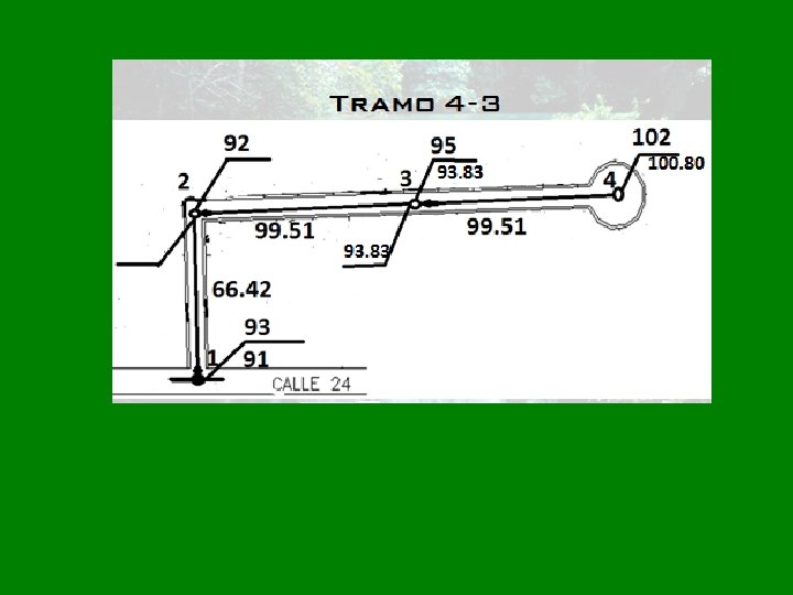 Tramo 4 -3 Longitud Tramo: L 4 -3=99. 51 mts. Longitud tributaria en cruces: Lt=0 Longitud Acumulada Lacum. = L 4 -3+Lt Lacum=99. 51+0=99. 51