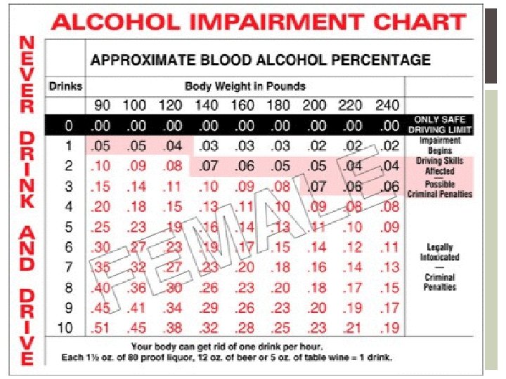 FACTORS 7. Drinking Time § The more time you take to consume one drink, and the time you allow between drinks the less you will be affected because of metabolism § 8. Medication/Illegal drugs § May increase alcohols effect on body