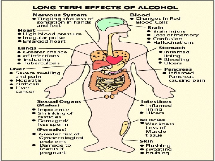 Long-term Effects of Alcohol on the Body 1. • • • 2. • • • To the Brain – Addiction – inability to stop drinking Loss of verbal skills, memory Major brain damage Cardiovascular Changes Damage to the heart muscle Enlarged heart – from increased workload caused by alcohol High blood pressure – can cause heart attack/stroke